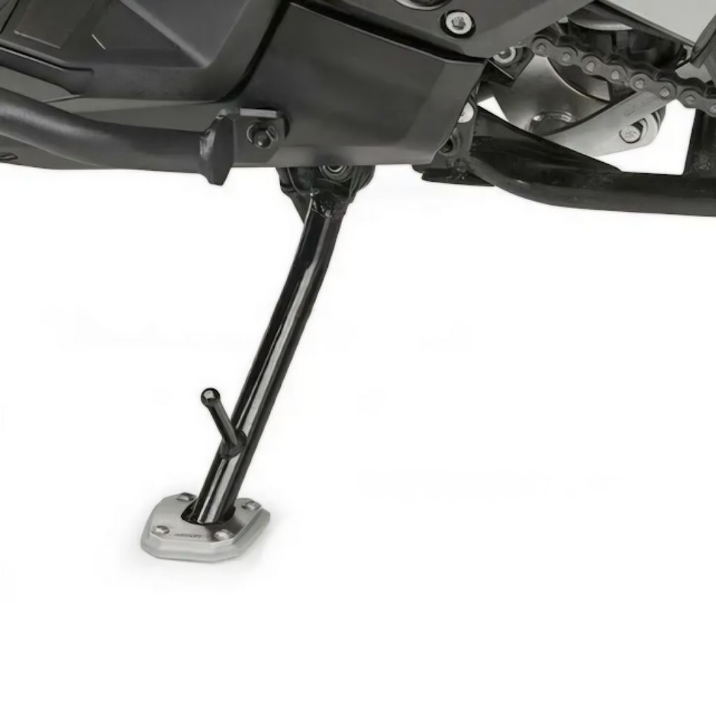 The side stand base plate for the HONDA X-ADV 750 is an additional plate designed to protect the stand and enhance stability. Its primary function is to prevent the stand from sinking into soft surfaces such as sand, mud, or gravel. This base plate is specifically designed for the mentioned motorcycle model.